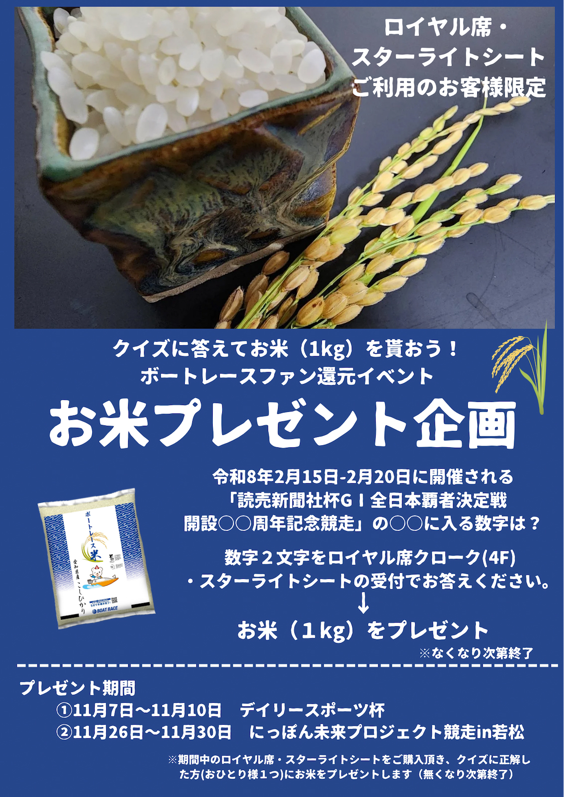 【ロイヤル席・スターライトシート限定】クイズに答えてお米(1kg)を貰おう!ボートレースファン還元イベントお米プレゼント企画