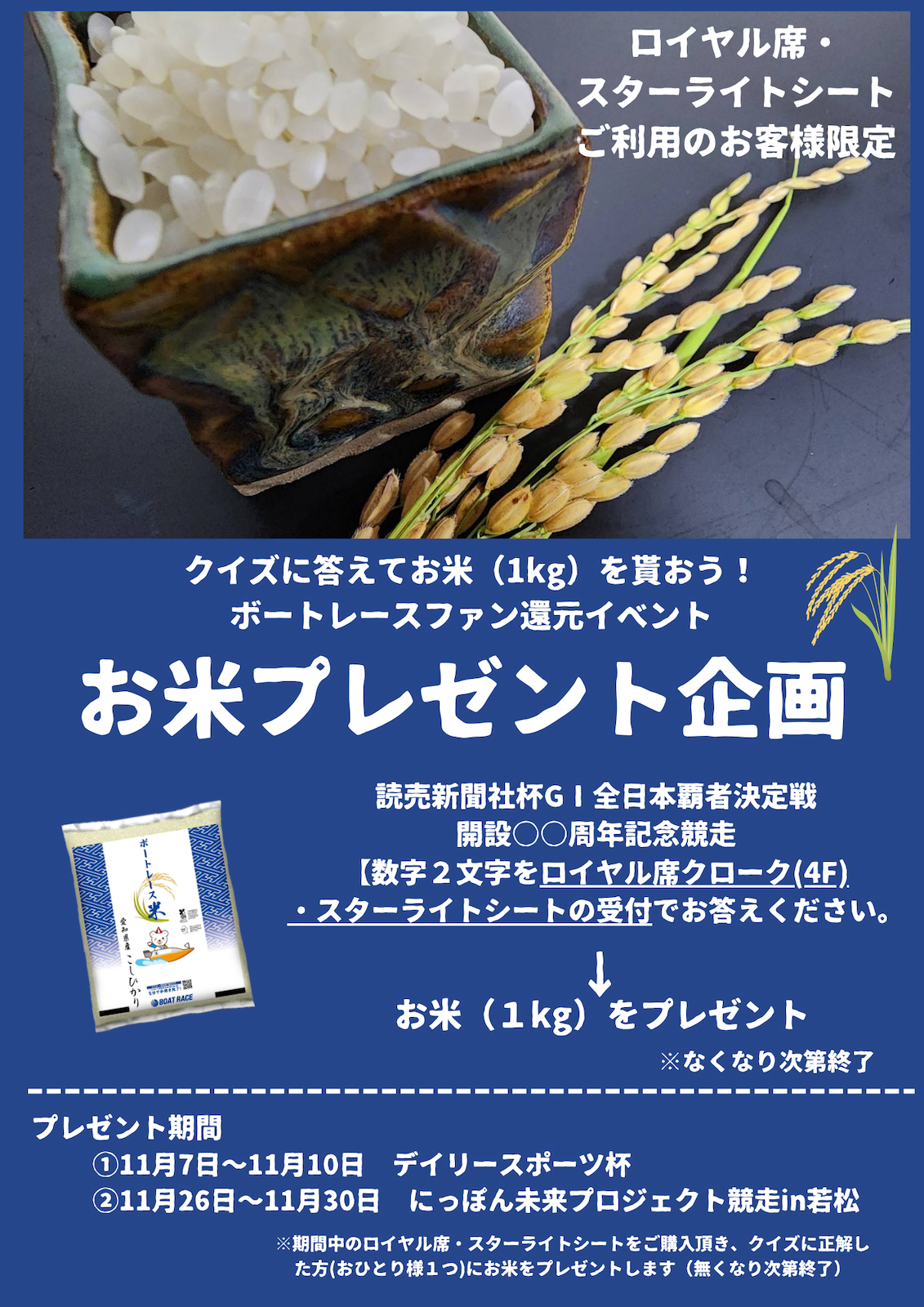 【ロイヤル席・スターライトシート限定】クイズに答えてお米(1kg)を貰おう!ボートレースファン還元イベントお米プレゼント企画